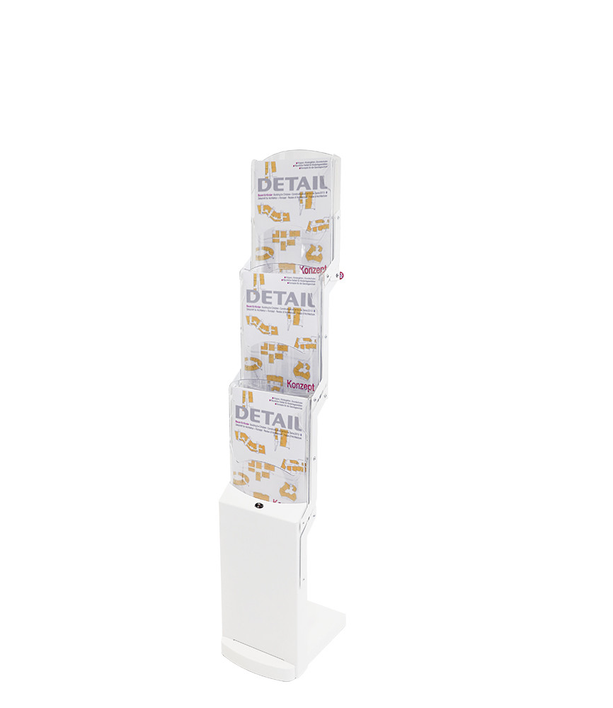 Material: Aluminium pulverlackbeschichtet, Prospektschalen aus schlagfestem Polycarbonat, Bodenplatte aus MDF mattweiß lackiert, Seitenstreben und Frontpaneele aus Aluminium, mattweiß pulverlackbeschichtet