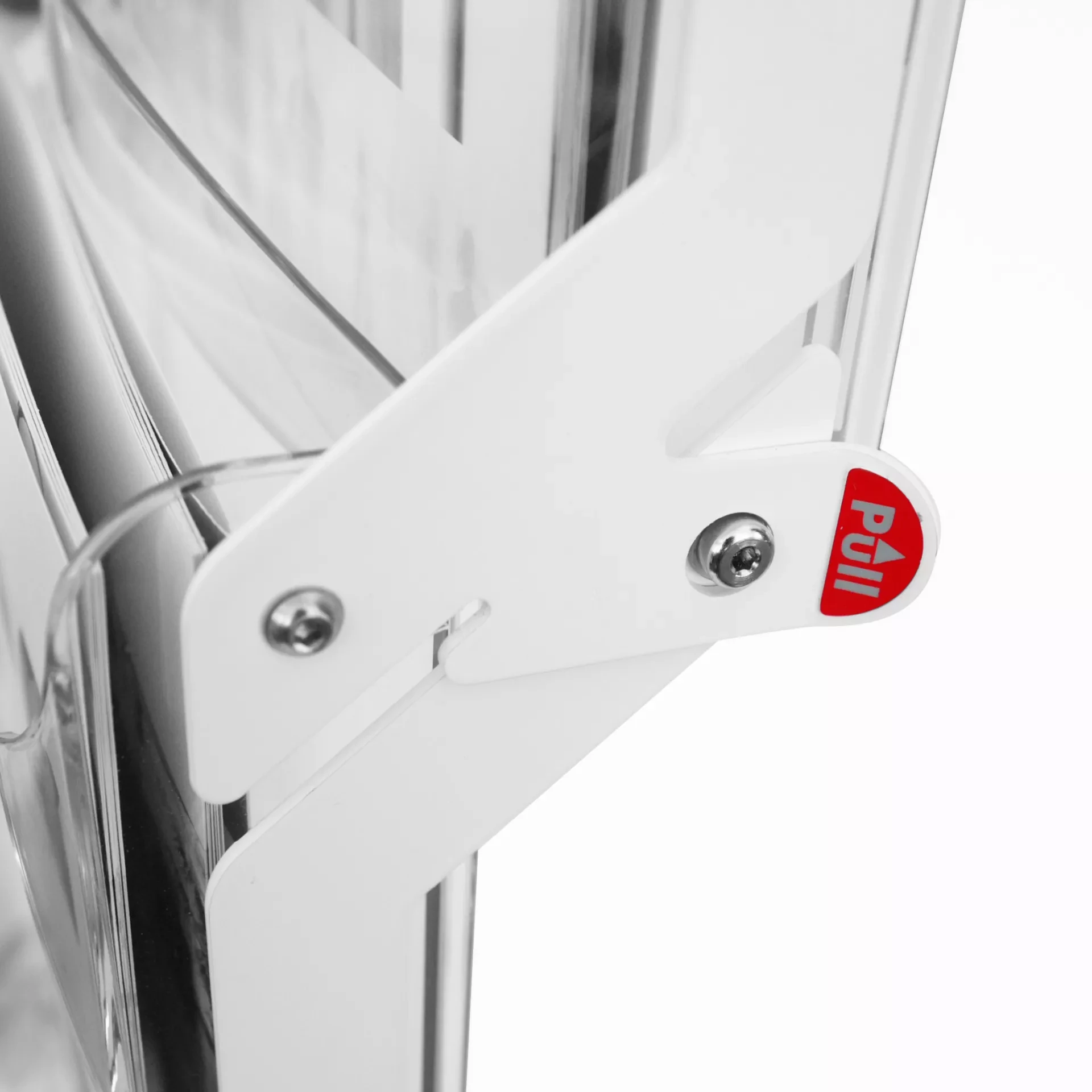 Der Real Bianco ist die stilvolle Variante des bewährten Real ZIP in der Trendfarbe Weiß. Real Bianco ist ebenfalls ein faltbarer und damit sehr mobiler Prospektständer, seine vier DIN A4 Prospekttaschen sind aus schlagfestem Polycarbonat. Die stufenförmige Staffelung und die ergonomisch geformten Seitenstreben in trendigem Mattweiß ermöglichen die bequeme Entnahme aus jeder der vier DIN A4 Prospekttaschen. Der Einzelblattkippschutz sorgt dafür, dass Ihre Prospekte auch bei großem Ansturm nicht herausfallen. Praktisch ist die vormontierte DIN A4 Postertasche am Frontpaneel, die sich für jeden Anlass mit einem individuellen Digitaldruck versehen lässt.