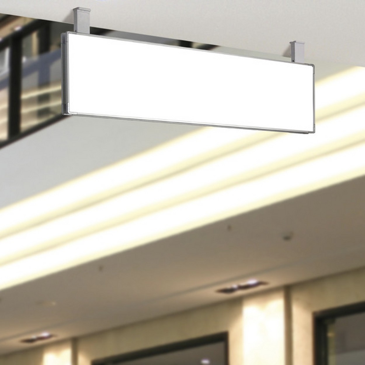 hängeschild der beschilderungsserie signcode mit silber eloxierten aluminiumprofilen. das schild zur direktbeschriftung signcode ist erhältlich in vielen grössen, ein- oder doppelseitig als wand-, decken- oder fahnenschild - das macht ihre moderne und flexible gebäudebeschilderung komplett!