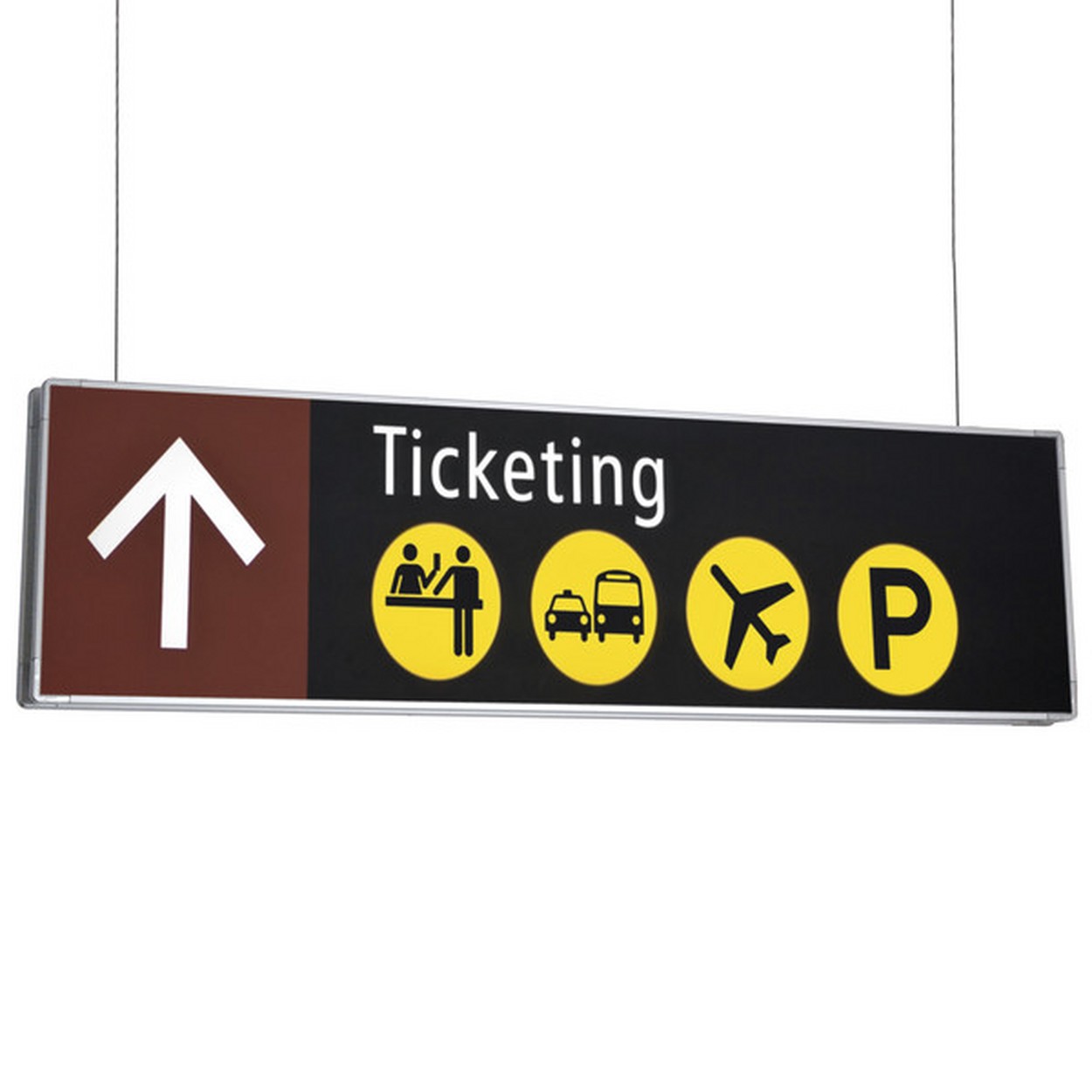 doppelseitiges deckenschild mit zweifacher abhängung am stahlseil der beschilderungsserie signcode mit silber eloxierten aluminiumprofilen. die schilder der linie signcode sind erhältlich in vielen grössen, ein- oder doppelseitig als wand-, decken- oder fahnenschild - das macht ihre moderne und flexible gebäudebeschilderung komplett! das abgehängte wegweisschild signcode verfügt über ein weiss beschichtetes aluminiumpaneel, das entweder direkt beschriftet oder aufkaschiert werden kann. system mit manipulationsschutz, der das öffnen der hinweisschilder durch unbefugte verhindert. ein gephaster, diskreter rahmen und die silber beschichteten ecken in abs machen ihr deckenschild signcode zu einem variablen und eleganten hingucker. die wegweisschilder der signcode-linie sind geeignet zur beschilderung von öffentlichen einrichtungen, krankenhäusern, bürogebäuden und allen weiteren gebäuden, in denen sie den besuchern und kunden die richtige orientierung geben möchten.