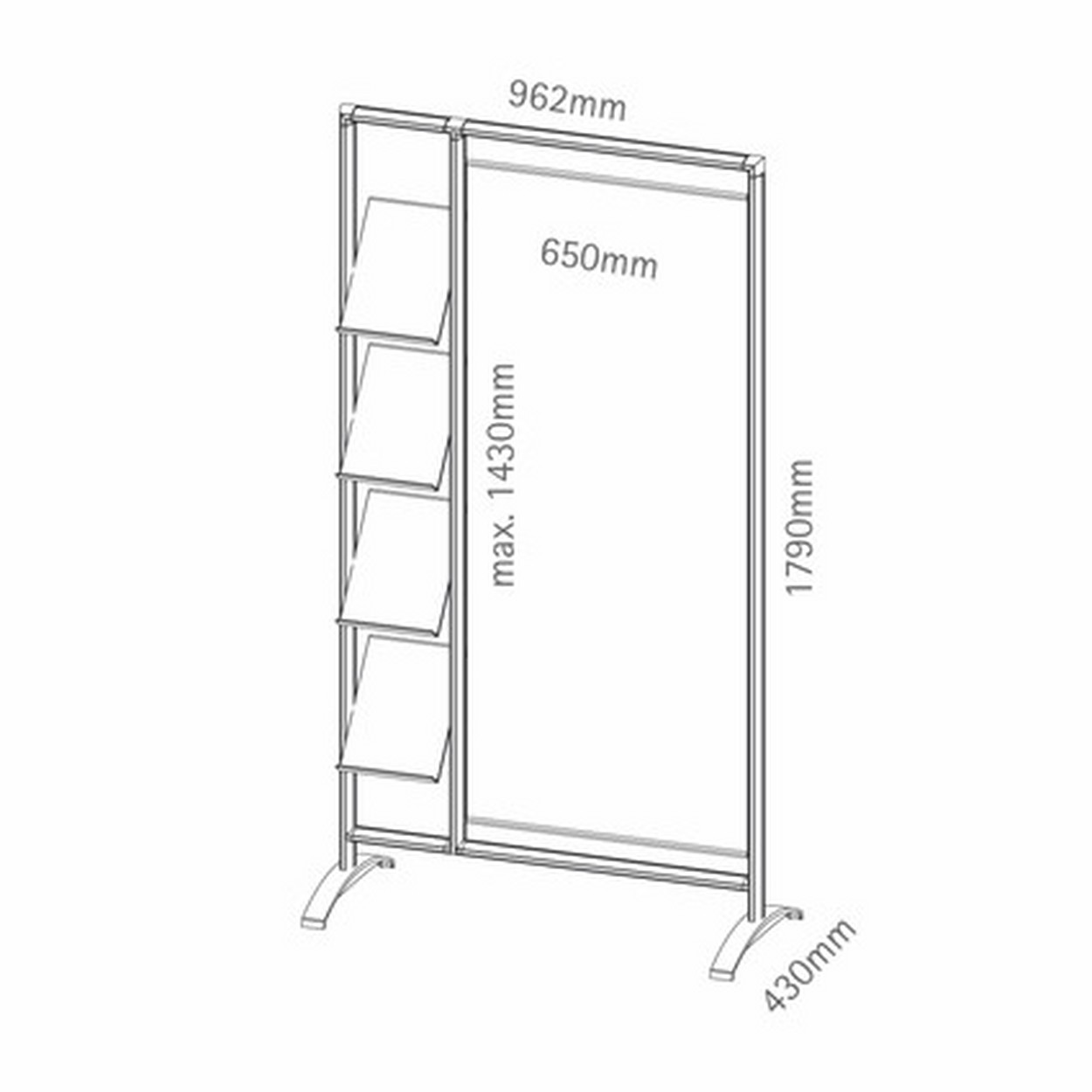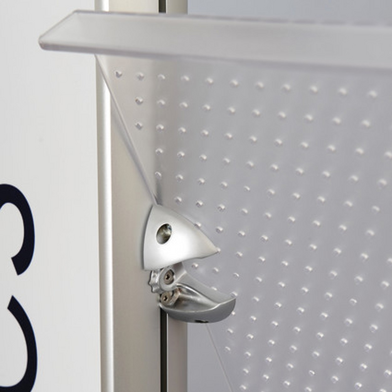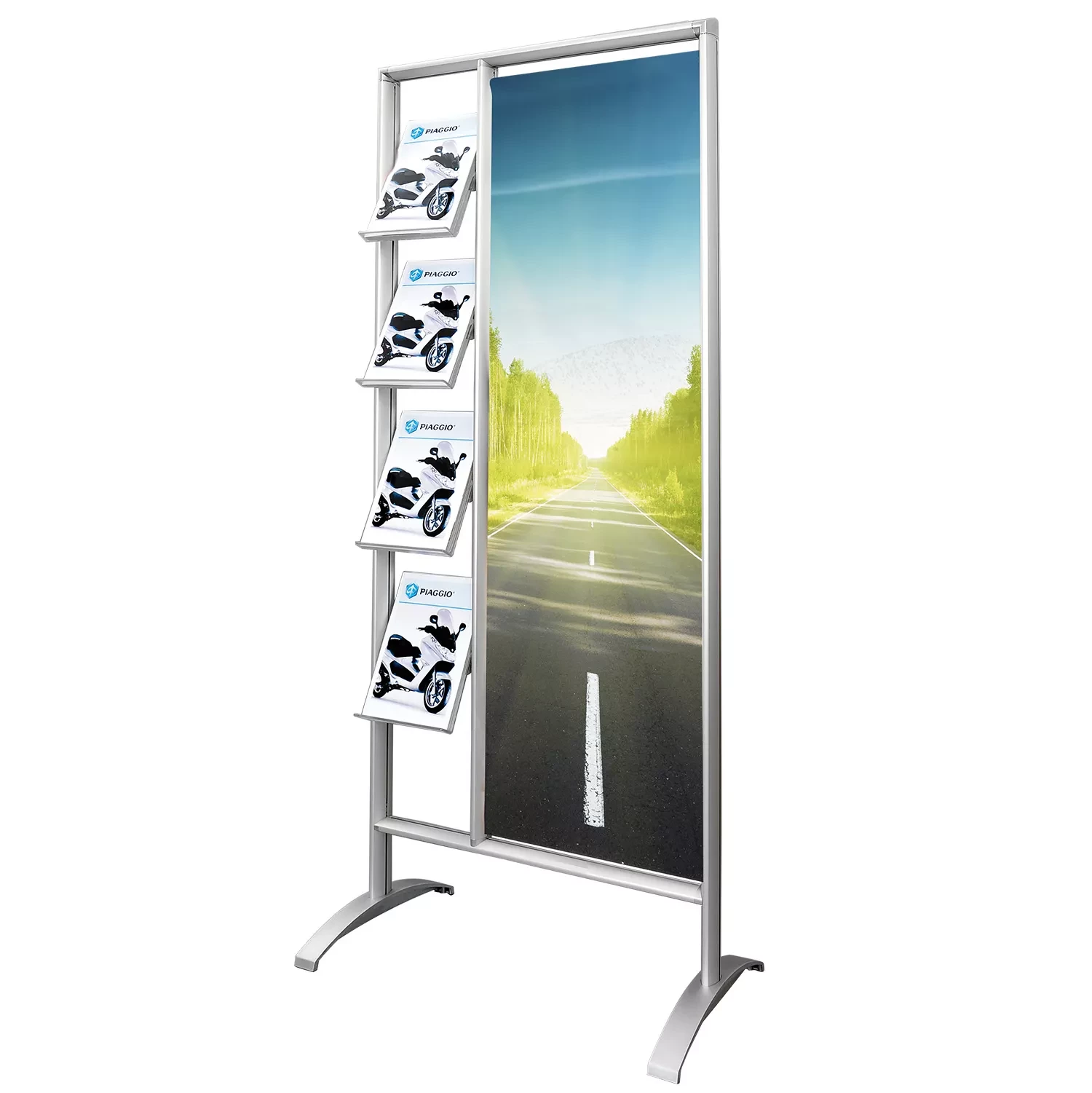 Mit Kombi verbinden Sie Katalog- und Digitaldruckpräsentation nahezu perfekt. Die vier Ablagen sind in 4 Stufen neigbar und bieten viel Platz für Printmaterial im Format DIN A4. Für die Befestigung des Digitaldrucks schieben Sie einfach die Haltestangen durch den Bannersaum und fixieren sie am System. Die Position der Haltestangen ist stufenlos einstellbar sodass Ihr Banner optimal gespannt wird. Dadurch lassen sich auch verschieden große Banner einspannen.
