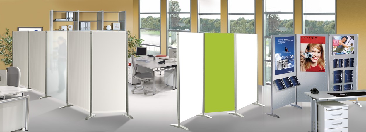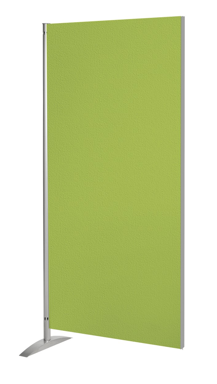 (45°, 90°, 135°) in beliebiger Länge und Kombination aufstellen. Am Ende der gesamten Wand muss stets eine Abschlusssäule montiert werden. Es können feste und rollbare Wände erstellt werden. Alle Metallteile sind pulverbeschichtet im Farbton alusilber. Das grüne Holz-Element dient als eleganter Raumteiler, welcher zusätzlich Geräusche blockiert.