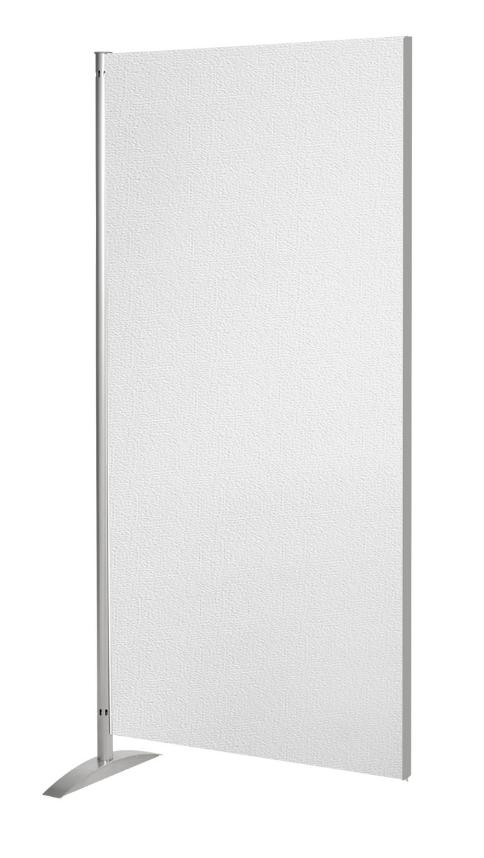(45°, 90°, 135°) in beliebiger Länge und Kombination aufstellen. Am Ende der gesamten Wand muss stets eine Abschlusssäule montiert werden. Es können feste und rollbare Wände erstellt werden. Alle Metallteile sind pulverbeschichtet im Farbton alusilber. Das weiße Holz-Element dient als eleganter Raumteiler, welcher zusätzlich Geräusche blockiert.