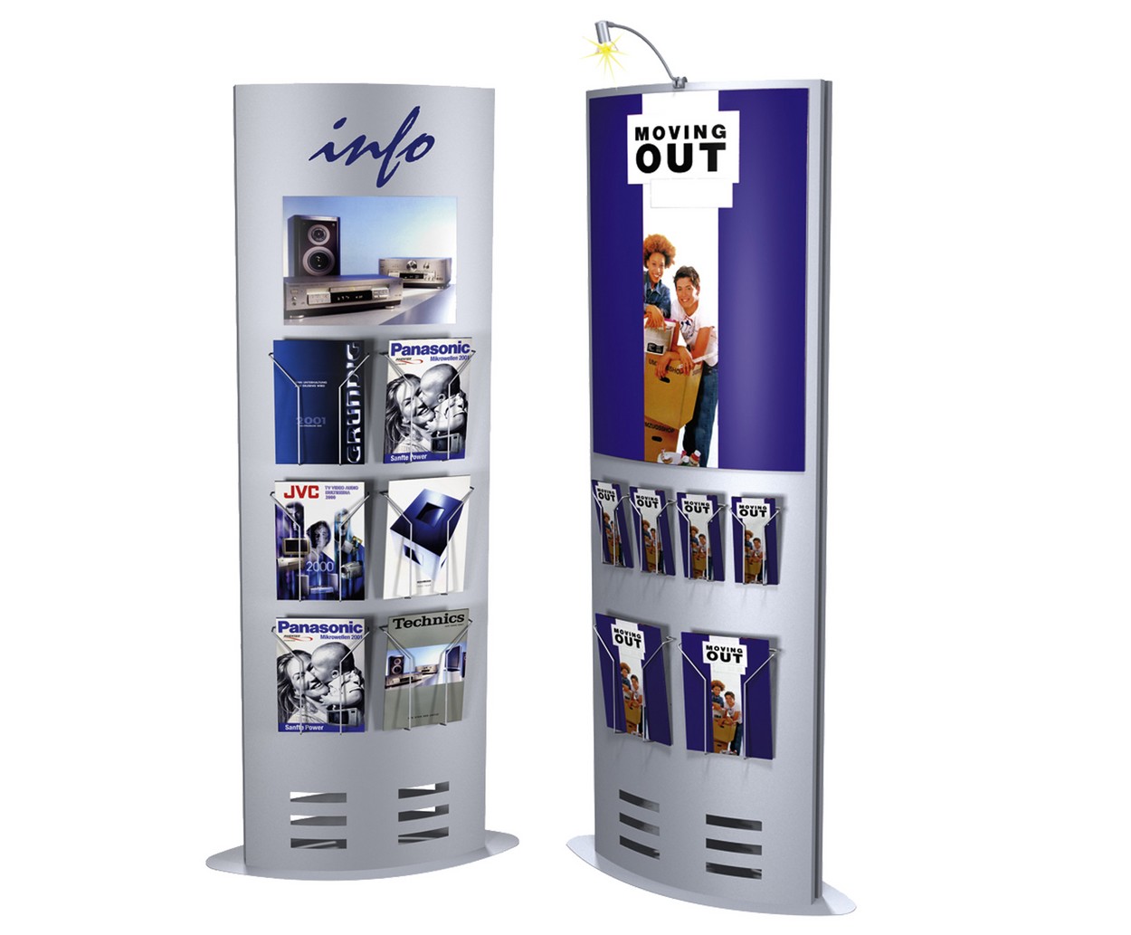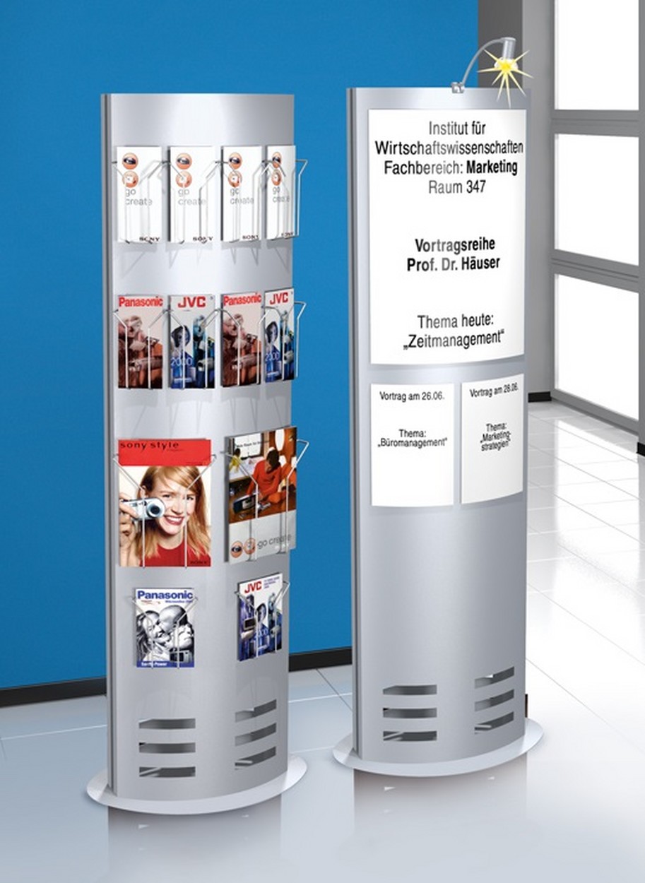 Vielseitigkeit ist die unumstrittene Stärke der Info-Säule. Sie ist beidseitig nutzbar und mit Postertaschen und Prospektfächern bestückbar. Die Postertaschen sind aus Kunststoff in Kristallglas-Optik und sind rückseitig mit Führungs- und Magnetleisten versehen. Somit lassen sich Ihre Werbebotschaften einfach und schnell aktualisieren. Die Prospektfächer werden in kleine, fast unsichtbare Löcher gesteckt, die in den Säulenkörper gestanzt sind und eine individuelle Anordnung ermöglichen. Nutzen Sie die optional verfügbare Beleuchtung, die Ihre Info-Säule ins rechte Licht rückt.