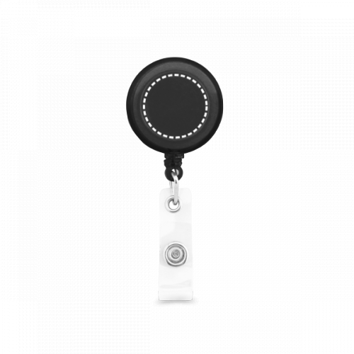Ausweishalter mit ausziehbarem Metallclip (bis zu 900 mm) mit transparentem Clip und einem Druckknopf um eine Ausweishülle zu befestigen. Der einziehbare Mechanismus erlaubt ein zielgerichtetes Vorzeigen des Ausweises. ø32 x 7 mm